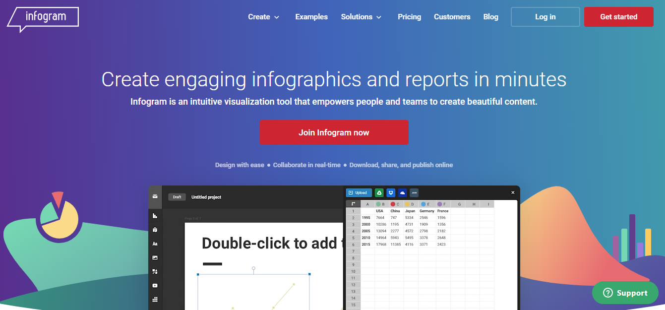 Infogram is a fully-featured drag-and-drop visualization tool that allows even non-designers to create effective visualizations of data for marketing reports, infographics, social media posts, maps, dashboards, and more.
